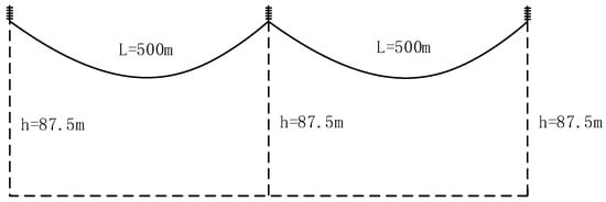 In the modeling process, the top of the insulator string was set as a fixed point where it connected to the transmission tower, as the transmission tower had little influence on the variation in the transmission line tension value. Considering that the conductor needs to be subjected to axial tension or pressure, a LINK10 rod element was used for the simulation, and the unit parameters were set to match the line characteristics [19]. The insulator string was conventionally modeled as an entire straight rod, and in order to make it closer to the actual force situation, 14 insulators were modeled using LINK8 cells and connected in an articulated manner [20].