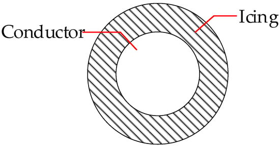 The tension in transmission lines is primarily determined by factors such as the weight of ice accumulation, conductor weight, and wind speed. The weight of the conductor was considered in the modeling process, so it was only necessary to translate the ice thickness and wind speed into loads applied to the conductor. Due to the complexity and diversity of icing on the transmission line, this study regarded icing on the transmission line as a uniform distribution of equal thickness of the icing along the conductor (as shown in Figure 2 of the cross−section of the conductor), in which the thickness of the icing was the thickness of the ice observed at the observation station.