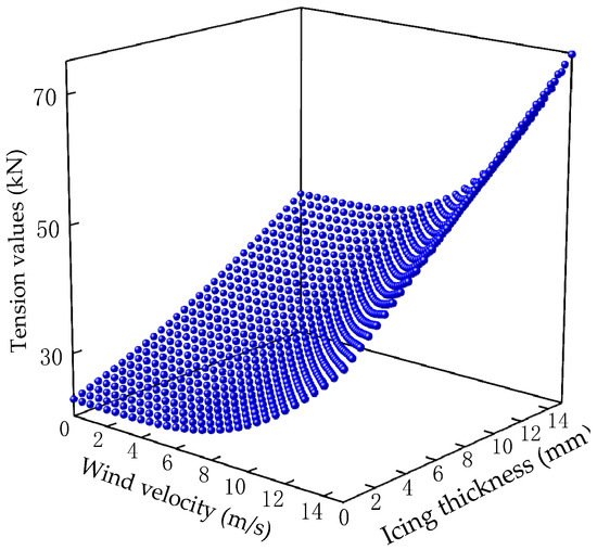 Based on the aforementioned finite element model and load simulations, the tension value of the transmission conductor was simulated under the influence of 0–15 m/s wind speed and 0–15 mm icing thickness, as shown in Figure 3. Origin software (https://www.originlab.com/origin, accessed on 13 December 2023) was used to fit wind speed, icing thickness, and tension values, with the following fitting equation: