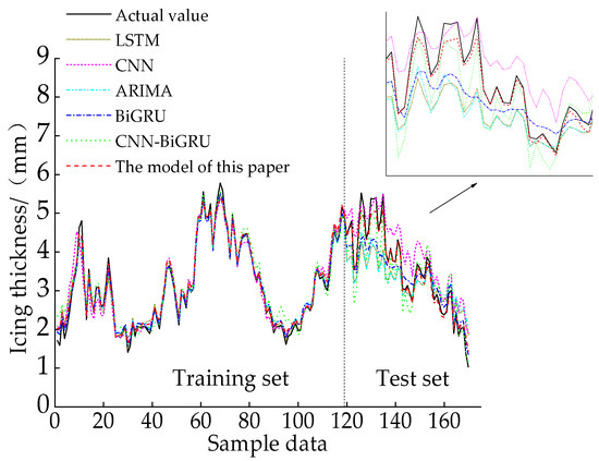 Comparative results of the prediction models proposed in this paper, and traditional models for the data provided by the observation station, are depicted in Figure 5, and the evaluation indexes of each model are shown in Table 3. It can be observed that the proposed prediction model in this paper performed the best. Compared with other prediction models, RMSE was reduced by 0.26–0.51, MAE was reduced by 0.24–0.44, MAPE was reduced by 5.77–13.33%, and R2 was increased by 0.07–0.13. Among them, the BiGRU model had better prediction accuracy than the LSTM, ARIMA, and CNN models, which verifies that its bidirectional structure and gating mechanism can effectively model the time dependence of icing changes; the prediction results of the CNN model exhibit obvious fluctuations, which indicates that its special network structure can effectively capture the features in the icing sequence. Both models indirectly demonstrated the superiority of the hybrid model, and the prediction accuracy of the CNN−BiGRU model was significantly higher than that of the traditional model. The model proposed in this paper, compared with the CNN−BiGRU model without considering physical constraints, showed a reduction of 61% in RMSE, a decrease of 67% in MAE, a decline of 58% in MAPE, and an increase of 7.78% in R2. This further emphasizes the significance and effectiveness of considering physical law constraints.