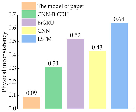 In addition to the evaluation metrics, ensuring the physical inconsistency of the model is a crucial metric in the prediction process [25], achieved by calculating the proportion of time steps for which the model makes physically inconsistent predictions (i.e., violates the physical laws presented in Equation (7)), and therefore performs a comparative analysis of the physical inconsistency based on the above model, as shown in Figure 6.