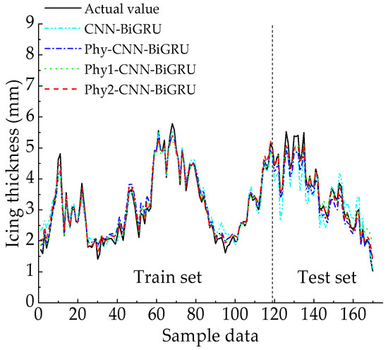 To assess the impact of different physical constraints on icing thickness predictions, the CNN−BiGRU model, Phy−CNN−BiGRU model, Phy1−CNN−BiGRU model, and Phy2−CNN−BiGRU model were used. Among them, CNN−BiGRU uses MSE supervised loss, Phy−CNN−BiGRU uses Soft−DTW + physical law constraints, Phy1−CNN−BiGRU uses MSE supervised loss + physical law constraints, and Phy2−CNN−BiGRU uses Soft−DTW supervised loss. Figure 7 and Table 4 present the prediction comparison results and evaluation indexes of the above models. The following is evident: