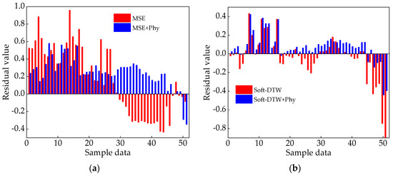 The above figures reflect the residual results for different physically constrained models: (a) residual analysis of the residual comparison results for CNN−BiGRU and PHY1−CNN−BiGRU; (b) residual analysis of the residual comparison results for PHY−CNN−BiGRU and PHY2−CNN−BiGRU.