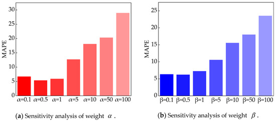 Sensitivity analyses were conducted on the weighting parameters in the loss function to verify the impact of and on the prediction performance. In the experiment, only the target weighting parameters were changed, and the remaining optimal parameter combinations are kept. Figure 9 presents the following observations: