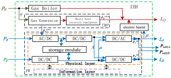 Figure 1 shows the structure of the IEH, containing equipment such as a PR, CHP, a converter, and electric heater equipment. The PR contains an information layer and a physical layer. The information layer is mainly responsible for the exchange of information with the outer structure and the control and protection of the PR; the physical layer is mainly responsible for the conversion between AC power and DC power inside the PR.