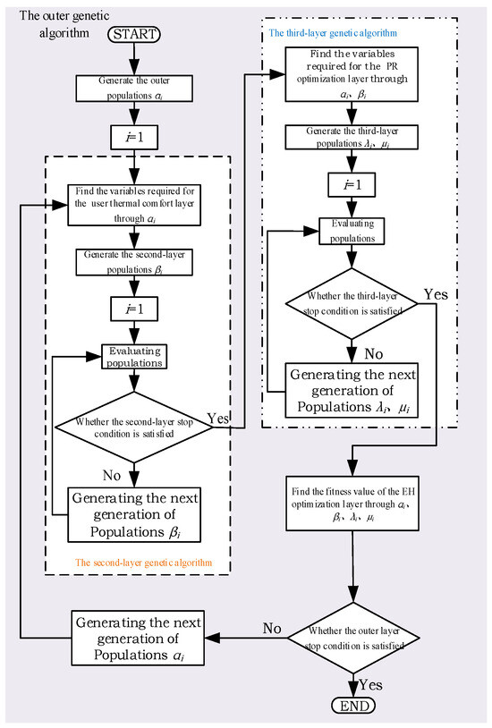 This study proposes an improved multi-layer nested quantum genetic algorithm (IMNQGA) to solve this objective function, and the flow chart of the algorithm is shown in Figure 2. In this algorithm, the second-layer genetic algorithm aims to find the optimal β of the user thermal comfort layer; the third-layer genetic algorithm aims to find the optimal λ and μ of the PR optimization layer; and the outer genetic algorithm calculates the optimal solution of the EH optimization layer based on the values of β, λ, and μ obtained by the inner two-layer algorithm. These three layers of the genetic algorithm are articulated and corrected by the constraints and the internal logic of the model, and then the overall optimal solution is obtained.