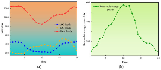 Load and renewable energy power curves. (a) Load curves. (b) Renewable energy power curves.