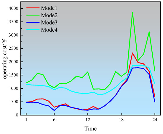 The algorithm proposed in this paper is used to solve the above four modes. The changes in the parameters of α, β, λ, and μ of the four modes within 24 h of optimization are shown in Figure 4. The PMV values and operating cost results obtained after optimization are shown in Figure 5 and Figure 6.