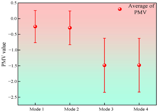 The PMV value is a comprehensive index used to evaluate the thermal comfort standard based on the equation of the human body’s heat balance state and considering human physiology, psychology, and other factors. The PMV value represents the average index of the population vote on seven levels of thermal sensation. A PMV value of 0 indicates moderate temperature, a PMV value of −1, −2, or −3 indicates slightly cool, cool, or cold, respectively, and a PMV value of +1, +2, or +3 indicates slightly warm, warm, or hot, respectively. The PMV value can be calculated using the following formula [31]: