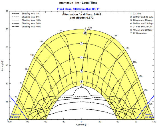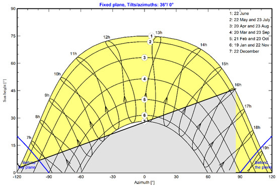 In Figure 3, horizon information and a graph displaying the sun’s trajectory are provided for the target area. The graph shows that the solar modules receive the sun’s rays during the best irradiation hours of the day, although the sun’s exposure times are very short on 19 January and 22 November and 22 December (for the 6th and 7th hours of the day). As a consequence, it was noted that the plant exhibited a lower performance during the winter months.