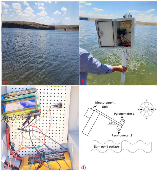 (a) Mamasın Dam Pond, (b) the albedometer, (c) measurement result, and (d) schematic representation of the measurement setup.