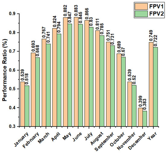 A graphical representation of the monthly simulated PR results for the FPV1 and FPV2 systems is displayed in Figure 8. According to the simulation, the PR of the FPV1 system equipped with a bifacial module was 74.92%, and the annual production was 1688.773 MWh/year. The greatest output, at 202.345 MWh (with a PR of 86.6%), was achieved in July, while the lowest, at 51.061 MWh (with a PR of 39.9%), was obtained in December. The FPV2 system with a monofacial module produced an annual energy amount of 1507.355 MWh/year, and its PR was calculated to be 72.22%. The peak yield of 179.618 MWh and PR of 83% occurred in July, whereas the least productive month was December with an output of 45.302 MWh and a PR of 38.3%.