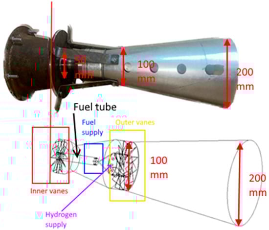 Figure 2 depicts a diagram of the burner device. The burner comprises internal vanes, a tapering channel, a fuel supply tube with holes, openings for hydrogen supply, and an outer ring of blades. During the experiment, the vanes were positioned at 30°, 40°, and 60° relative to the burner axis.
