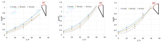 The baseline conditions are represented with γ = 0%. Compared to this base mode, flame stabilization increases significantly. Across all angles, the stabilization range at all speeds does not exceed φLBO = 0.03–1.8. Increasing the proportion of hydrogen leads to significant stabilization. At the maximum hydrogen fraction, stabilization increases by 3.5 to 4 times for all variations.
