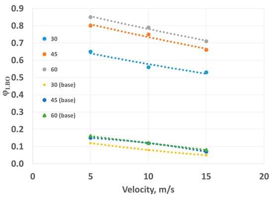 Figure 5 illustrates the relationship between lean blow-off and the angle at a constant hydrogen fraction value. An increase in velocity leads to a decrease in flame stabilization characteristics, particularly noticeable at a 30° angle. This can be attributed to the underdeveloped recirculation zone’s inability to sustain a high-temperature flame due to the small proportion of fuel and a large proportion of air, which cools the gases. As the vame angle increases, stabilization characteristics improve. Notably, the difference between the angles of 30° and 45° is much more significant than between the angles of 45° and 60°. This disparity occurs because a smaller angle lacks the necessary “anchor” to maintain the mixture in a specific zone and at a certain temperature at higher speeds. For an angle of 45° and the same values of the hydrogen fraction, the equivalence ratios are as follows: 30° − φLBO = 0.39, 45° − φLBO = 0.41, 60° − φLBO = 0.47. For comparison, baseline conditions have been presented, where the hydrogen fraction is set to 0%. Flame stabilization with 30% hydrogen fraction is significantly higher than that without it. With a hydrogen fraction of 0%, at maximum air velocity, the flame lean blow-off occurs at values of φLBO = 0.03–0.07 for various vane angles.
