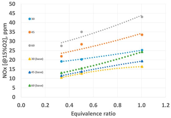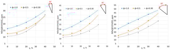 Figure 7 illustrates the relationship between the concentrations of nitrogen oxides at a constant hydrogen fraction of 30%, the equivalence ratio, and the vane angle. In essence, this graph highlights the impact of swirl on NOx concentration. If we disregard the proportion of nitrogen introduced with the fuel combustion, then the variation in concentrations—i.e., the dependence on the vane angle—ranges from 25% to 35%. This observation indirectly suggests that altering the vane angle increases stabilization and concurrently raises the nitrogen oxide concentration by approximately 25% to 40%. When compared with baseline conditions, an increase in the equivalence ratio leads to an increase in NOx concentration. Compared to the γ = 30% option, the NOx concentration is lower. For example, at an angle of 45° and an equivalence ratio of 1.0, the concentration is 12 ppm. When hydrogen is added, this value is 27 ppm.