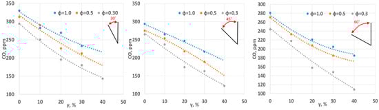 At a 30° angle, there is a noticeable reduction in CO concentration as the proportion of hydrogen increases. This relationship appears to be nearly linear. For instance, with a hydrogen fraction of 30%, CO concentration is 233 ppm at φ = 1.0, 212 ppm at φ = 0.5, and 180 ppm at φ = 0.3. In general, the difference between these values is approximately 8–10%. The primary reason for the decrease in CO, aside from the higher hydrogen content, is the decrease in φ, leading to a higher proportion of air. This results in excess of the oxidizing agent and oxygen-free radicals in the combustion area, allowing CO to be completely oxidized.