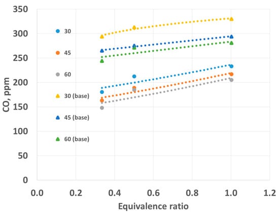 For a more in-depth analysis of the influence of the blade angle and equivalence ratio, Figure 9 illustrates the relationship between CO concentration, vane angle, and φ, with a constant hydrogen fraction. This figure reveals a general linear dependence of CO concentration on the equivalence ratio. This behavior can be attributed to the fact that the presence of free oxygen radicals in the combustion zone is the most crucial factor for CO formation in any combustion process. An increase in the equivalence ratio signifies a higher proportion of fuel in the combustion zone, which in turn reduces the presence of free oxygen radicals due to the oxidation of individual fuel elements. It is worth noting that CO concentration is also influenced by the degree of mixing. Greater fuel-oxidizer mixing, in our case with air, results in lower CO concentration. This is because improved mixing enhances the likelihood of encounters between CO and oxygen radicals, which are essential for combustion.