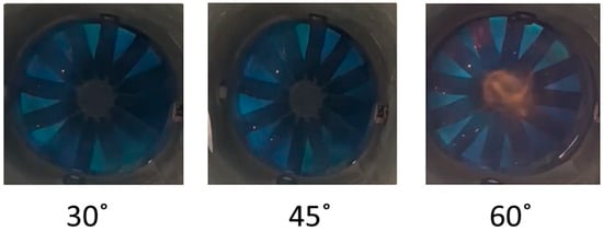 Figure 10 shows the flame shape behind the blades at various vane angles. The shape and color of the flame are similar to the results obtained in [24]. The photographs were taken at φ = 1.0 and γ = 10%. As can be seen from the figure, the flame has 12 divided parts, which corresponds to the number of vanes at the exit. The flame is blue and evenly distributed throughout the combustion zone. As is known, the color of the flame is determined by the stoichiometric ratio. For example, an increase in the proportion of fuel leads to the appearance of “yellow” spots, indicating a high temperature and some underburning of the fuel. In this case, this is especially noticeable at small vane angles of 30–45°. It was not possible to photograph the torch along the axis due to the design features of the burner apparatus. Increasing the vane angle to 60° leads to the appearance of a yellow high-temperature zone with a relative diameter of 52 mm. This bright zone confirms the results obtained for CO and NOx concentrations. In this zone, a high-temperature recirculation zone is formed, which leads to high flame stabilization due to the constant ignition of the mixture, even at high speeds. On the other hand, the recirculation zone leads to a longer residence time of gases in this zone, which leads to an increase in NOx. On the third hand, high temperature and long residence time of gases in this zone leads to a complete combustion reaction, i.e., oxidation of CO to CO2, which reduces CO concentrations.