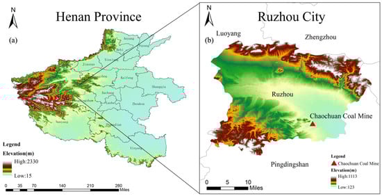 Mines were selected for the study. (a) Topographic and geographic division map of Henan Province, China; (b) Topographic map of Ruzhou City and county and city adjacencies, location of the Chaochuan Mine.