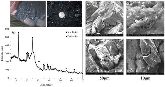 Coal samples and their fine structure. (a) The sample of crushed particles obtained in the field; (b) crushed particle; (c) coal particles at 1000 magnification; (d) coal particles at 1000 magnification; (e) coal particles at 1600 magnification; (f) coal particles at 1600 magnification; (g) clay minerals calibrated in XRD tests.