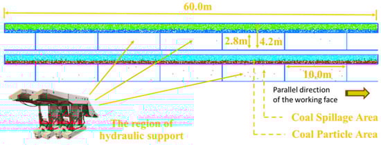The simulation restored the crushing state of top coal before releasing it down. The crushed particles flowed toward the back of the hydraulic support and gradually moved to the coal release opening to be recovered.