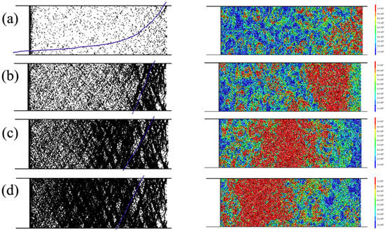 By observing its evolutionary process, it can be noted that crack development undergoes distinct stages of initiation, propagation, and transfer from right to left. This phenomenon is attributed to support provided by a rigid wall on the left side, resulting in predominantly compressive and shear damage on the more stressed right side of the coal body. The direction of crack penetration aligns at an angle equal to (where φ represents the internal friction angle). As crushing progresses continuously, significant fragmentation occurs in the right coal body, leading to a gradual reduction in bearing capacity and subsequent stress transfer towards deeper regions on its left side. Stress transfer is ahead of schedule compared to the crushing process.