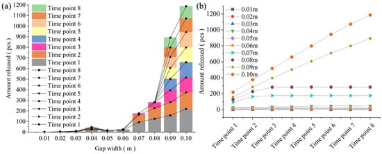 Coal leakage with different rack spacing. (a) Release at different hydraulic support rack spacing; (b) release at different time points.