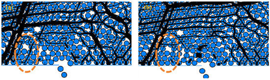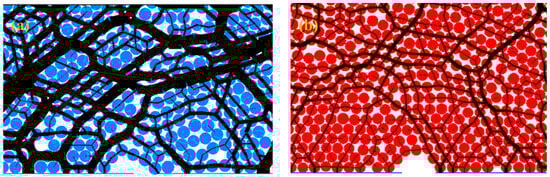 In models made using the parallel bonding ontological relationship, a large number of particles are usually bonded to form constructs of multiple shapes, while the mechanical properties of the constructs are described using the holistic approach. The fact that the constructs are composed of multiple particles also allows the constructs to be modeled with tensile, shear, and torsional mechanical characteristics. When the stress on the construct exceeds its corresponding bond strength, the bond relationship between particles will be broken, the bond relationship at the corresponding particle contact will be degraded to a linear relationship, and the construct as a whole becomes multiple smaller constructs that continue to move, as shown in Figure 4.