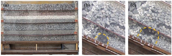 In Figure 16b, the simulated particles form a lower-positioned arch at the coal release opening, and the particles are articulated. The right side of the arch is connected to the coal release opening. The arch formed by the particles in Figure 16c is at a higher position above the coal release opening, and the arch is not connected to the coal release opening, but it also stops the flow and release of top coal at the coal release opening.