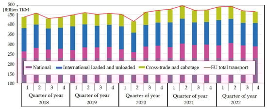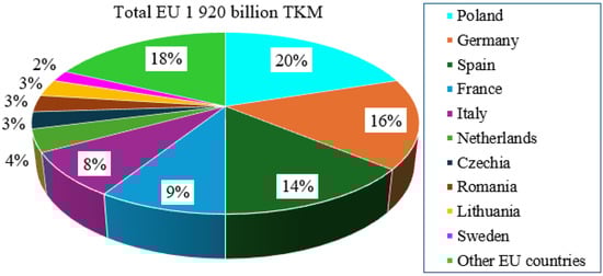 Road freight transport is a significant contributor to the economy and a crucial component of both internal and international trade in Europe and beyond [1]. Poland is the top performer in the road transport sector within the European Union (EU), accounting for 19.8% of the total ton-kilometers (TKM) in the EU, surpassing Germany (16.0%) and Spain (14.1%) [2], as illustrated in Figure 1 below.