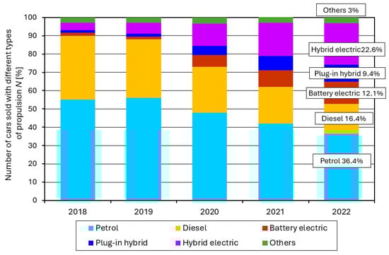 New EU passenger cars sold by power source-market share 2018–2022. Drawing made by the authors based on available data found in the paper [3].