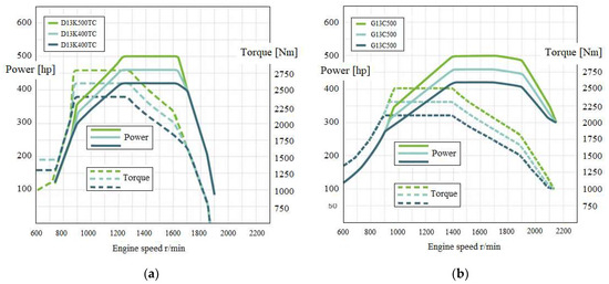 Power and torque characteristics: (a) diesel; (b) DF. Drawing made by the authors based on available data found on the vehicles’ producer website [34].