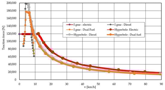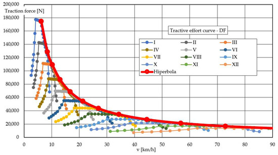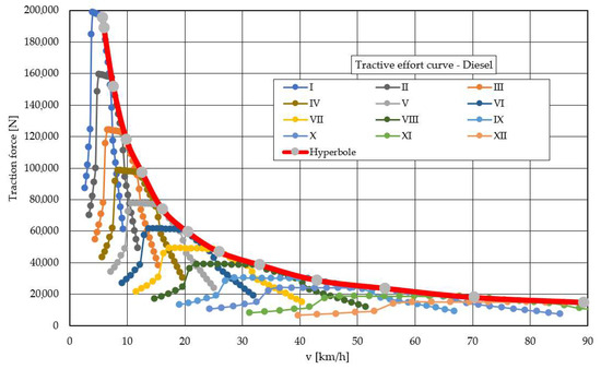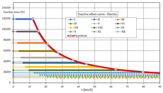Tractive effort curves serve as a comparison tool for the performance of vehicles with varying designs. These curves are depicted through a diagram that illustrates the relationship between the traction force (FT) exerted on the vehicle’s wheels and the driving speed (v) [36,37].