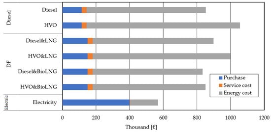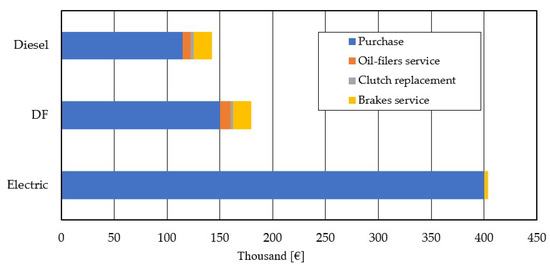 To compare the costs of vehicle maintenance due to the differences in the drive, elements that distinguish specific drives in the context of their service were selected. Electric vehicles, due to recuperation, do not wear brake discs and pads in such an intensive way, and there is no need to change oil and filters, as is the case with ICE. According to the information obtained about the authorized Volvo repair service [38], the cost of the oil and filter service is PLN 2999 (EUR ~640). In the case of service costs for DF, due to the linkage of the maintenance of LNG tanks and additional fuel filters, as well as the higher MOT cost, the total cost of servicing was increased by 30% in comparison to the FH500 Euro VI. Oil and filter servicing should be performed every 120,000 km. Replacing a set of brake discs and pads for one axle is PLN 800 (EUR ~170). It is worth remembering that the use of an electric vehicle also reduces the wear of the brakes on the towed semi-trailer. In the comparison for semi and trailer combination, it was established that brakes are replaced after 150,000 km, and in the case of EV, it is four times less often, i.e., 600,000 km. The considered distance is the lifetime of the truck 1.5 million kilometers. A one-time replacement of the clutch in ICEs (EUR 2.500) was also assumed. Figure 10 below shows the costs associated with the purchase and maintenance of selected vehicles: