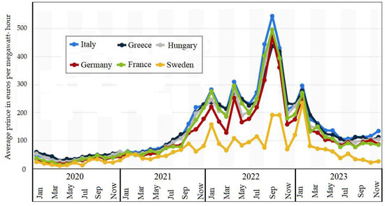 Average wholesale electricity costs in European countries since January 2020. Drawing made by the authors based on available data found in the paper [39]. Average price in euros per megawatt-hour.