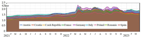Average diesel fuel prices in European countries since January 2021. Drawing made by the authors based on available data found in the paper [41].
