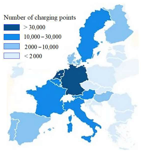 The distribution of EV charging stations in Europe. Drawing made by the authors based on available data found in the website [47].