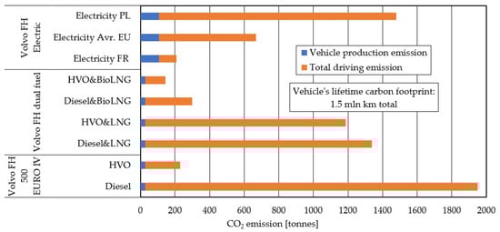 For the purpose of calculations for this article, the average net price for fuels was taken: diesel—1.75 EUR/L [39]; HVO—2.2 EUR/L [42]; LNG—2 EUR/kg [43]; BioLNG—1.6 EUR/kg [44]. AdBlue consumption was assumed at 0.2 L/100 km and cost 0.6 EUR/L. Fuel/electricity consumption for ICEs and EVs was selected in accordance with Table 1. Figure 13 below shows the costs related to fuel over a lifetime of 1.5 million kilometers for individual selected configurations.