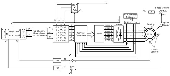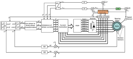 The block diagram in Figure 1 presents the system’s complete structure adopted in the computer simulation stage. The modeling described in the next section and the other topics describe the main parts, requirements, and restrictions for the system to function as a bearing motor (blue block).