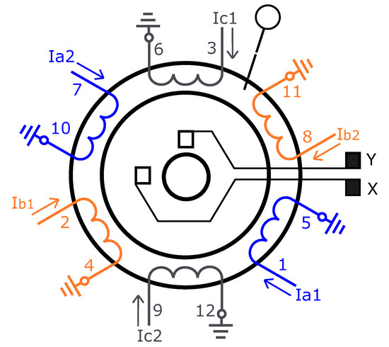 The machine’s structure adopted as a reference in this work has three phases, four poles, and utilizes the squirrel cage rotor; the coils are connected in series to form a phase group, and each phase group has two diametrically opposite coils, according to Figure 2. Figure 2 shows the distribution of the coils in the stator and the currents in each half group of the winding for the bearing motor used in the research. Figure 2 shows the stator winding distribution, where there is a 120∘ phase shift angle between each phase group axis. Figure 2 below describes the unbalance of the currents for the position control. In order to reduce the system’s complexity, it was considered that the rotor be centered for the simulations. Note that is the stator current, and represents the rotor current.