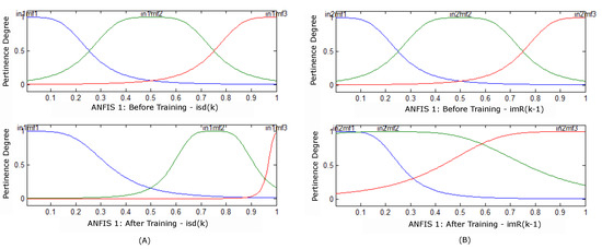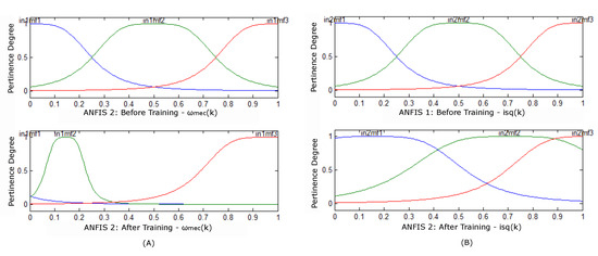 It is observed that after the end of the training, the pertinence functions of Figure 5 were adjusted for each input of estimator 1 of Figure 3A. With the result of the training of the ANFIS 2 estimator, the membership settings for the entries were obtained. Figure 5 illustrates the behavior before and after mechanical speed training.