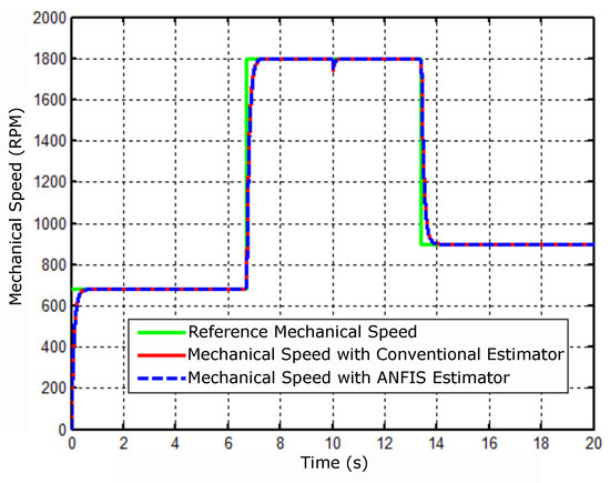 The simulations were run in the range of 0 to 20 s. The result shown in Figure 6 shows the mechanical speed of the motor simulated subject to the following reference changes 680, 1800, and 900 rpm, and then a perturbation at the instant 10 s is applied. The disturbance was an application of a load torque with a nominal value of N·m.