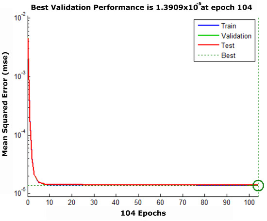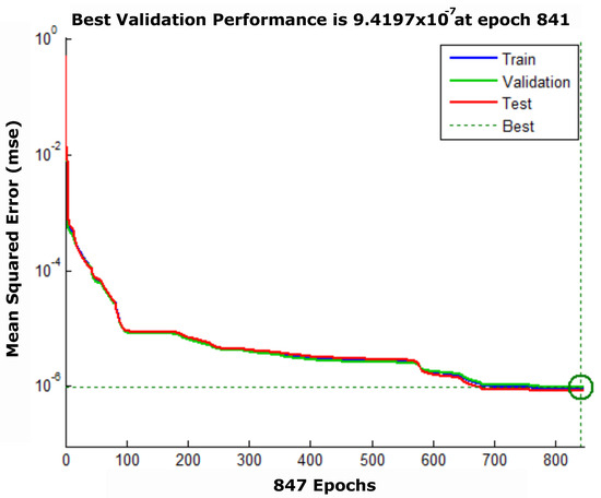 The topology in Table 4 was chosen after several performance tests with a different number of layers and neurons per layer, the algorithm of chosen training was the Levenberg–Marquardt. Figure 9 shows the error curve obtained with network training neural.