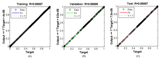 Figure 10 shows the R parameter at the top. This parameter indicates the relationship between the output and the target, varying between 0 and 1. The closer to 1, the better the prediction. After training, the weights were adjusted, and the neural network simulation replaced the PI control in Figure 1.