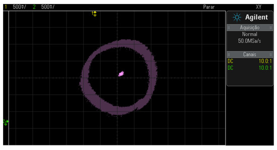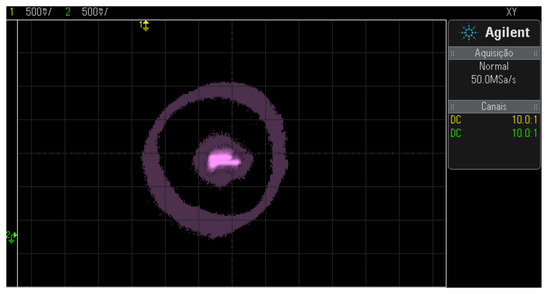 The results were collected in a steady state. The experiment performed operated at the frequency of 60 Hz according to Figure 27. The spot in the center of the figures represents the positions that the rotor has assumed in a given moment: the oscilloscope is in trace persistence mode.