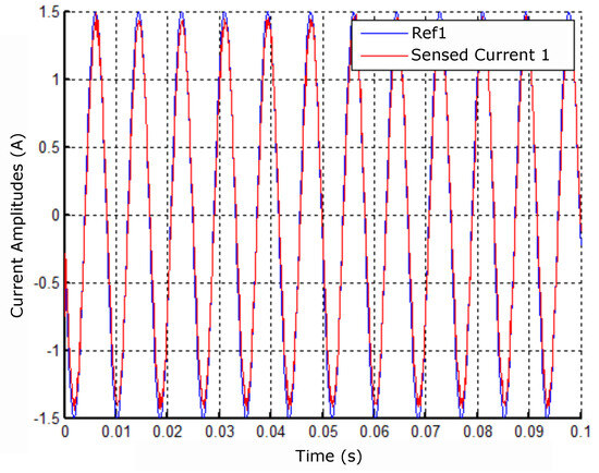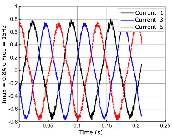 In order to illustrate the dynamics of cascading control, the results considered an equal time window for the position controllers and the current operating at a frequency of 60 Hz. Figure 28, Figure 29 and Figure 30 show the results of the cascading current and position controllers accordingly with the block diagram of Figure 24. The graphic of Figure 28A shows the reference currents, that is, the imposed currents , , and for control of position, collected at an interval of s.