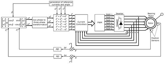 The article describes the implementation details of controllers that provide the operation of the bearing motor. The system is made up of current, radial rotor position, and speed, which operate in a cascade. Control loop implementations started with the loop from the innermost (fastest) control to the outermost (slowest) loop, following the sequence: current control, position control, and speed control. Speed and position controllers are responsible for the generation of reference currents for current control. Other articles dealing with the topic of Bearingless Induction Motor are listed below [15,16,17,18,19,20].