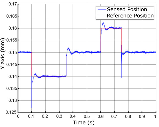 The graph in Figure 28B, identified by the subtitles Ref1, Ref2 and Ref3, represents the composition of the reference currents , , and with the signs from position controllers , , and . Finally, the graph in Figure 28C represents the equivalent sensed currents in each phase. Figure 29 and Figure 30 show the responses of the X and Y positions with their respective reading errors associated and control signals. There is a small change in the behavior of the sensed currents in Figure 28 at times close to s, for example. This change is due to the control adjustment of the position of Figure 29 and Figure 30 and observed in the control signals for the X and Y positions.