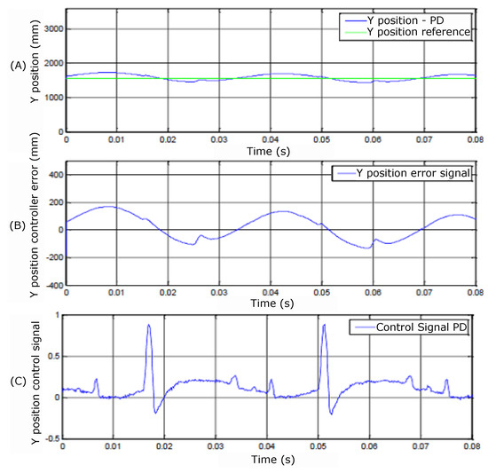 (A) Y position; (B) controller error; and (C) control signals.